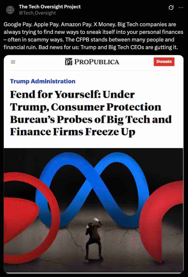 🤑 OPERATION: Personal Enrichment: As President Trump and co-President Elon Musk continue to make life easier for financial criminals and Big Tech fraudsters, a cadre of Senate leaders (spearheaded by Senate Banking Ranking Member Elizabeth Warren and Senate Finance Ranking Member Ron Wyden) sent a letter Friday to the Office of the Comptroller of the Currency and the Federal Reserve. They demanded that the agencies explain how they’ll protect our financial system from the conflicts of interest posed by the president’s planned for-personal-profit stablecoin, “USD1.”