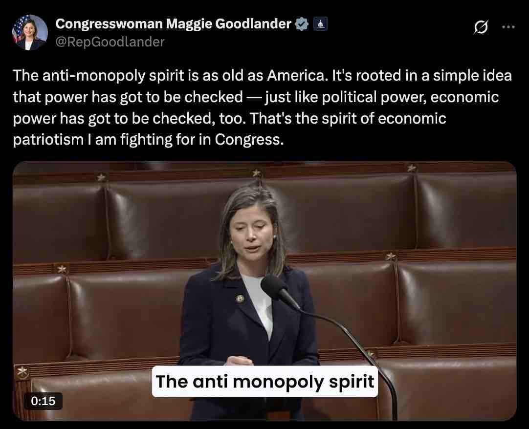 “The anti-monopoly spirit is as old as America. It’s rooted in a simple idea that power has got to be checked — just like political power, economic power has got to be checked, too. That’s the spirit of economic patriotism I am fighting for in Congress.”