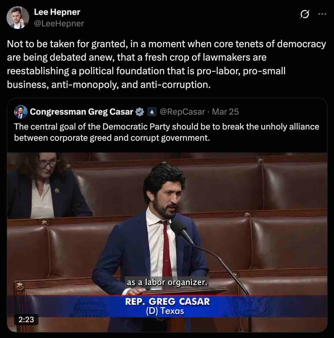 🦅 NEW ECONOMIC PATRIOTS TAKE FLIGHT: A new crew of populist-minded House Democrats launched a new economic working group with a powerful credo: the way forward for the party is economic populism and taking on corporate monopolies. Reps. Chris Deluzio, Maggie Goodlander, and a half dozen others say that to bring the party roaring back, Democrats need to channel a “fighting spirit” – and Big Tech is squarely in their sights.